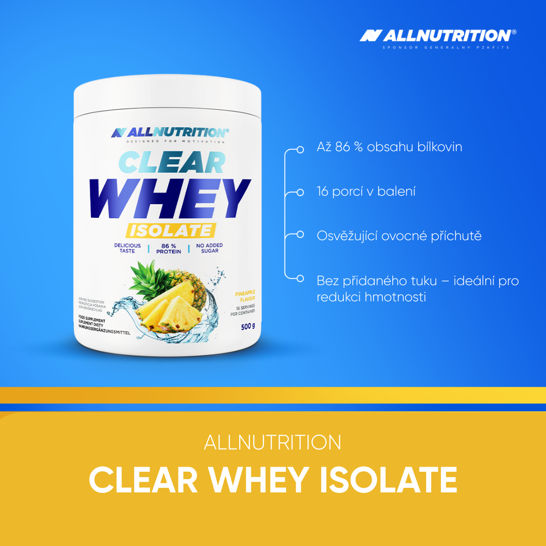 ALLNUTRITION CLEAR WHEY ISOLATE je revoluční proteinový doplněk WPI, který umožňuje připravit lehký a osvěžující ovocný nápoj. Obsahuje až 86 % proteinů a je bez přidaného cukru. Na rozdíl od klasických shakeů nemá mléčnou pachuť. Tyto proteiny jsou na míru tvým požadavkům – lehké a jednoduše chutné!