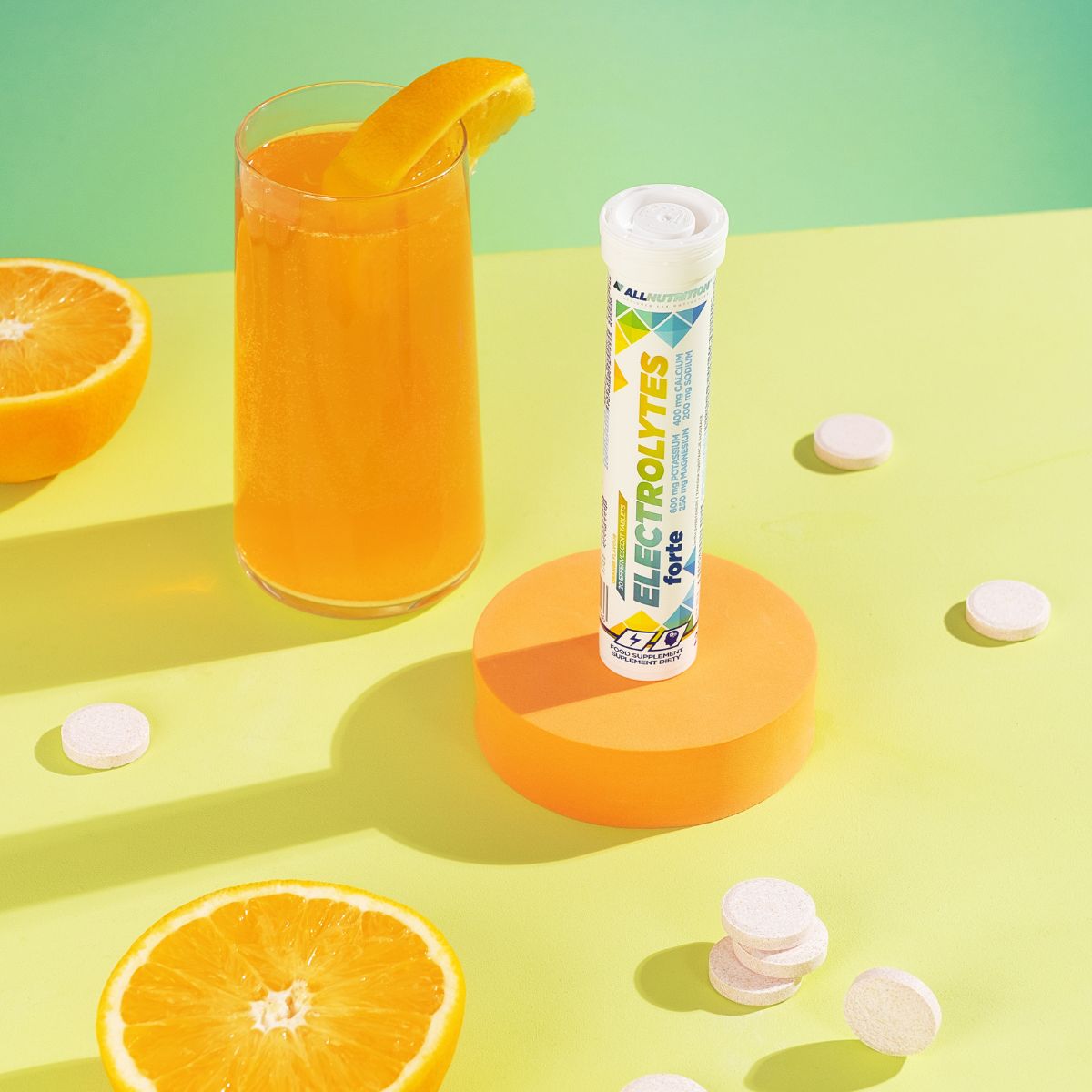 ALLNUTRITION ELECTROLYTES FORTE je doplněk stravy ve formě šumivých tablet s lahodnou pomerančovou příchutí. Pokročilé složení bylo vytvořeno pro rychlé doplnění důležitých elektrolytů a vitamínů ztracených při intenzivní fyzické námaze, pocení nebo během horkých dnů. Postarej se o správnou hydrataci a rovnováhu svého těla!