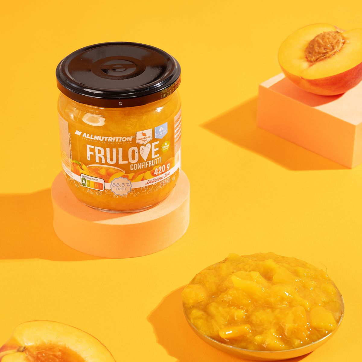 FRULOVE CONFIFRUTTI PEACH je ideální jako doplněk k oblíbeným jídlům – palačinkám, ovesným kaším, jogurtům a fit dezertům. Proměň svá jídla v chutná fit mistrovská díla!