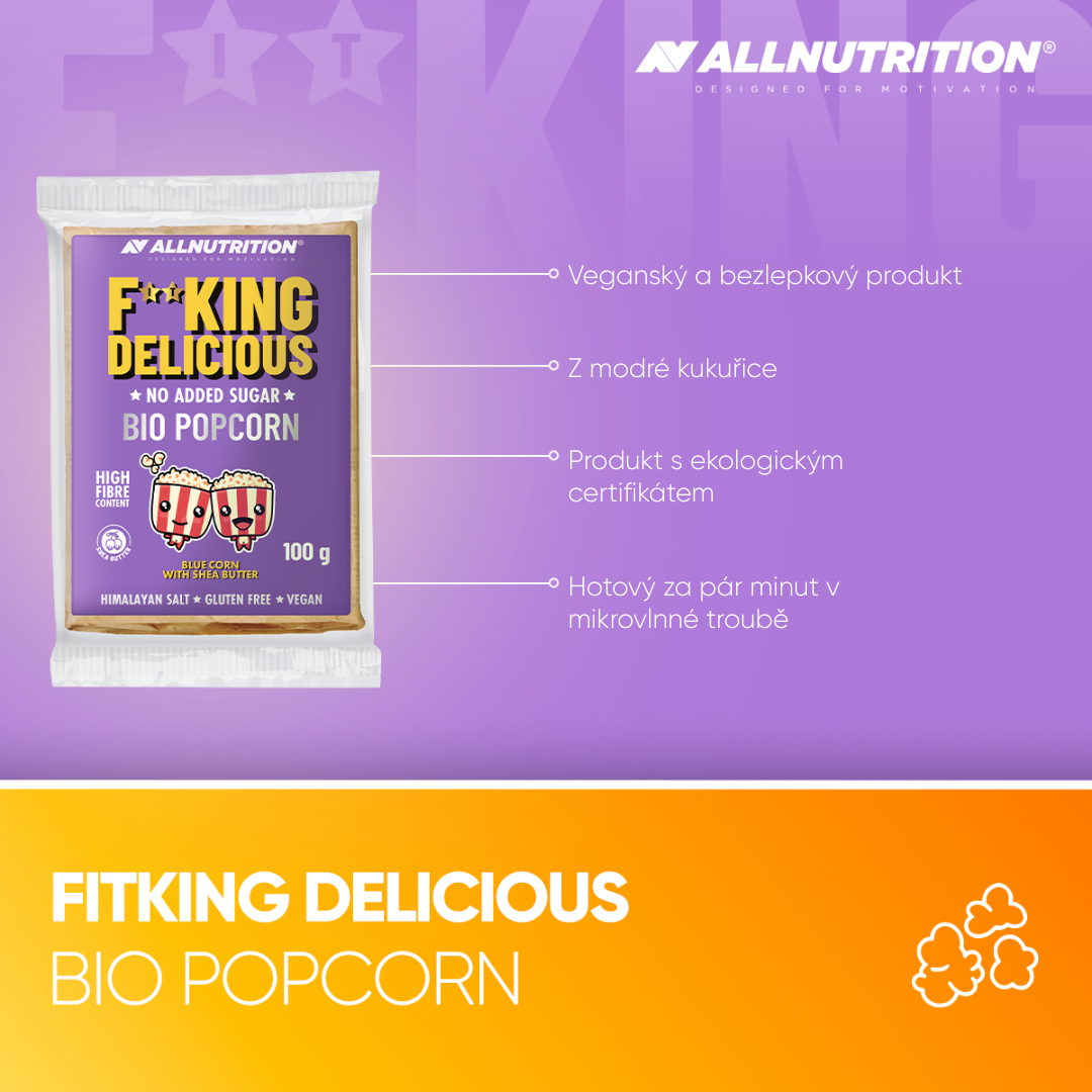 ALLNUTRITION FITKING DELICIOUS BIO POPCORN je ideální slaná svačina pro každého, kdo hledá alternativu ke klasickému popcornu. Vytvořený z ekologické modré kukuřice, bez přidaného cukru – obsahuje pouze přirozeně se vyskytující cukry. Místo palmového oleje jsme použili bambucké máslo! Je to rychlý a jednoduchý způsob, jak si připravit lahodný popcorn, který se perfektně hodí k filmovému večeru. Vysoký obsah vlákniny, veganská formule a jednoduché složení – to je přesně to, co potřebujete!