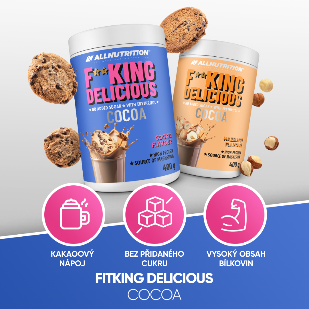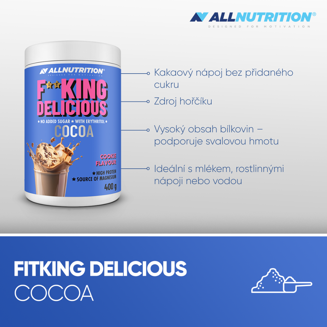 ALLNUTRITION FITKING DELICIOUS COCOA je moderní alternativa k tradičnímu kakau – bez přidaného cukru, zato s vysokým obsahem bílkovin a přídavkem hořčíku. Tento funkční nápoj s intenzivní chutí kakaa je skvělou volbou pro ty, kteří dbají na linii, omezují cukr ve stravě nebo hledají lehký a hodnotný dezert.