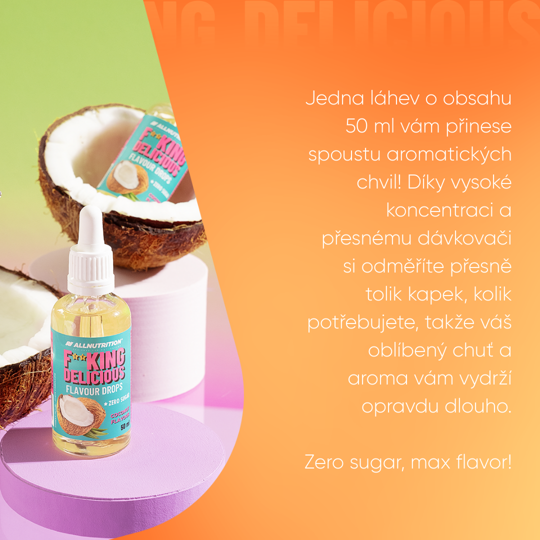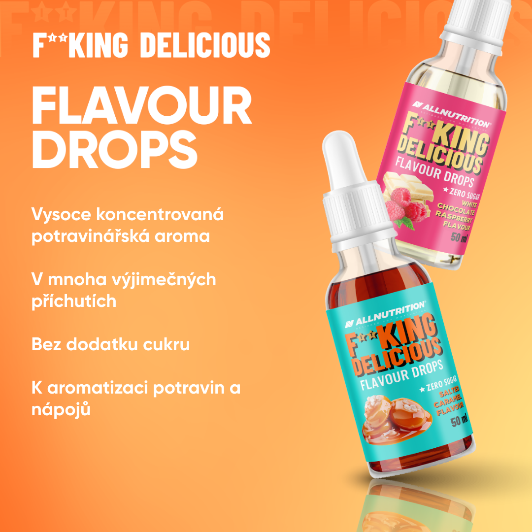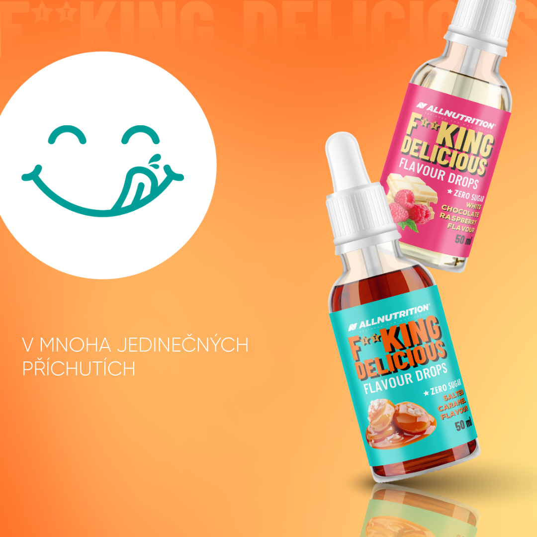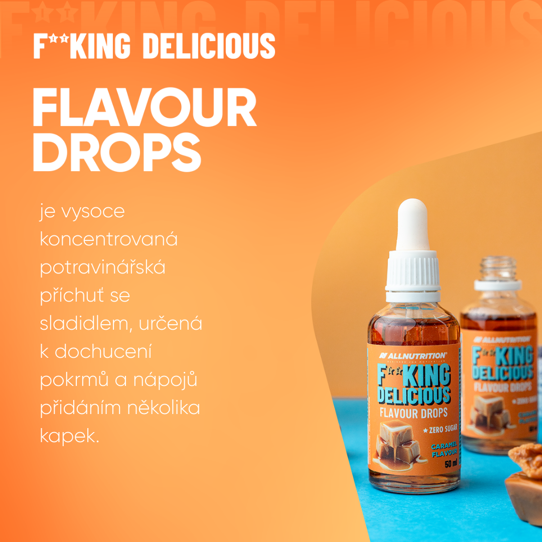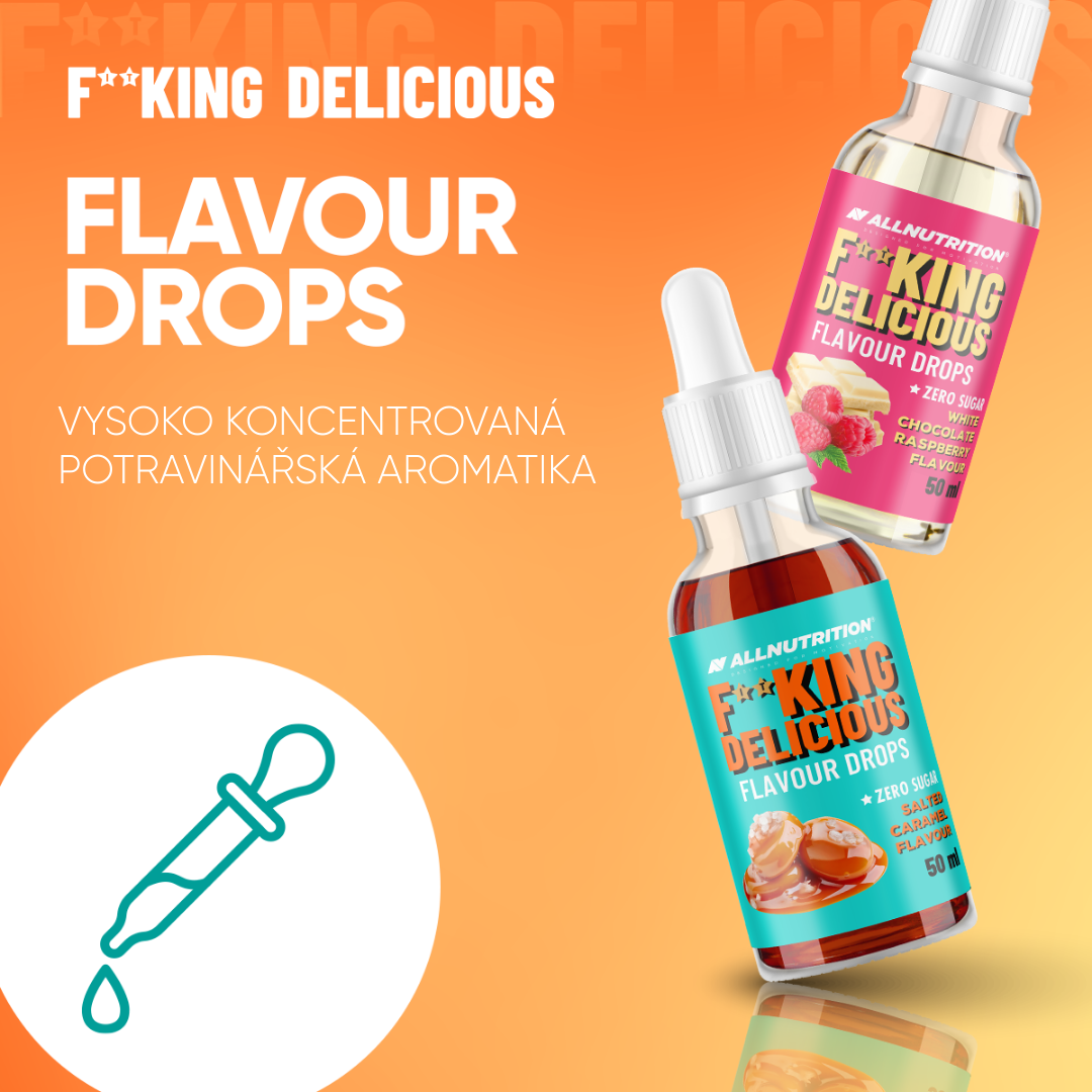 ALLNUTRITION FITKING DELICIOUS FLAVOUR DROPS je vysoce koncentrované potravinářské aroma se sladidlem, určené k dochucení jídel a nápojů přidáním několika kapek.