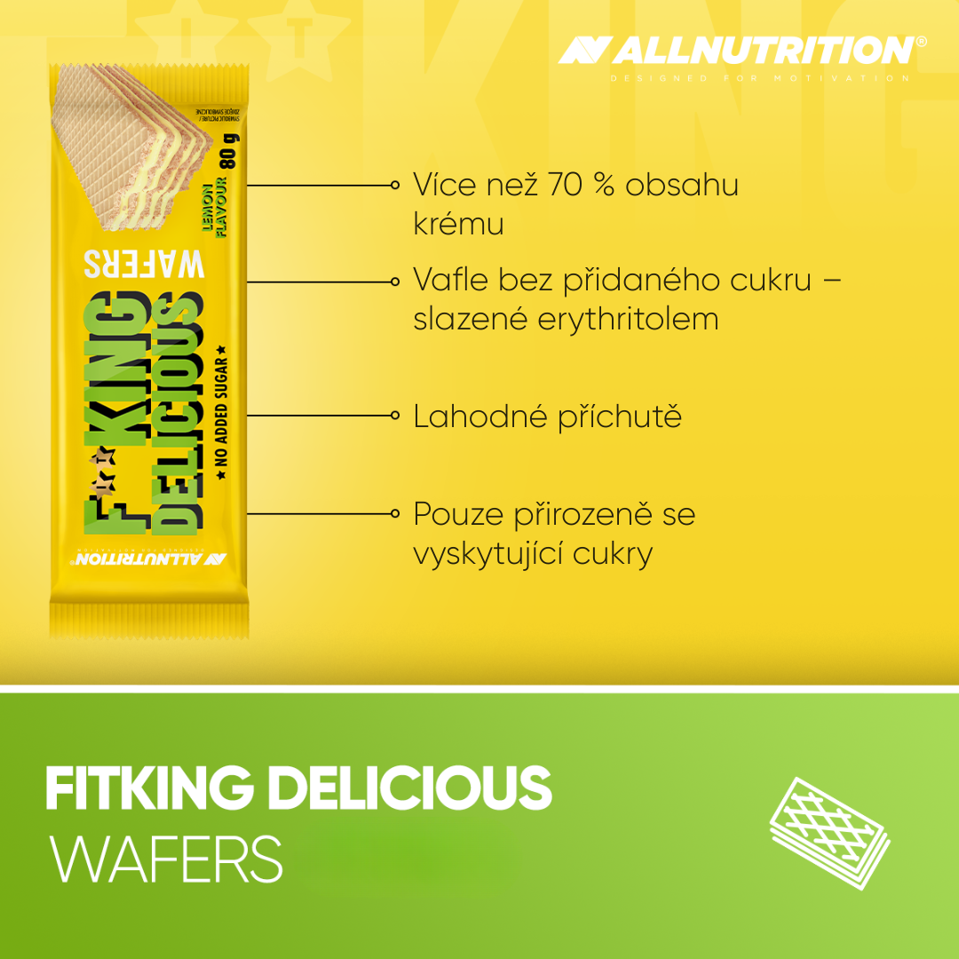 ALLNUTRITION FITKING DELICIOUS WAFERS jsou neuvěřitelně lahodné oplatky se smetanou bez přidaného cukru! Balení obsahuje 2 porce, z nichž každá se skládá ze 4 vaflí proložených krémem s kakaovou, smetanovou nebo oříškovou příchutí. Bez výčitek svědomí je můžete chroupat ke kávě nebo si na nich smlsnout po tréninku! :)