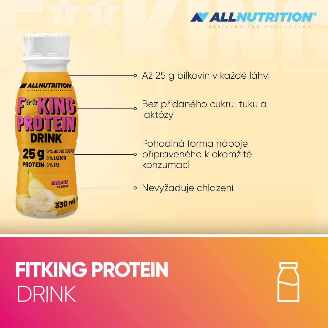 ALLNUTRITION FITKING PROTEIN DRINK je chutný, vysokoproteinový mléčný nápoj dostupný ve dvou jedinečných příchutích – vanilkové a banánové. Každá láhev dodává až 25 g bílkovin a zároveň neobsahuje přidaný cukr, laktózu ani tuk. Je to pohodlná volba pro každého, kdo chce doplnit svou stravu o kvalitní živiny – bez ohledu na denní režim. Skvěle se hodí do práce, na cesty, po aktivitě nebo prostě tehdy, když potřebujete něco rychlého a výživného.