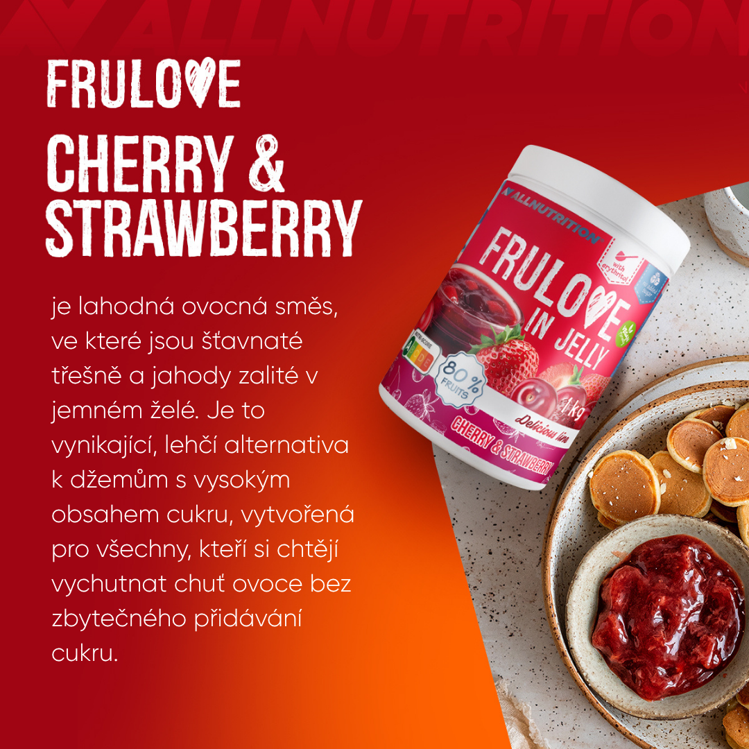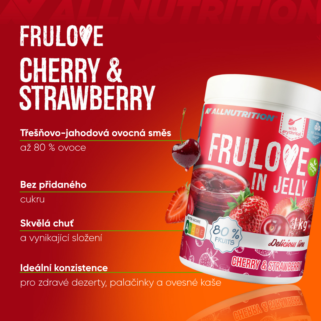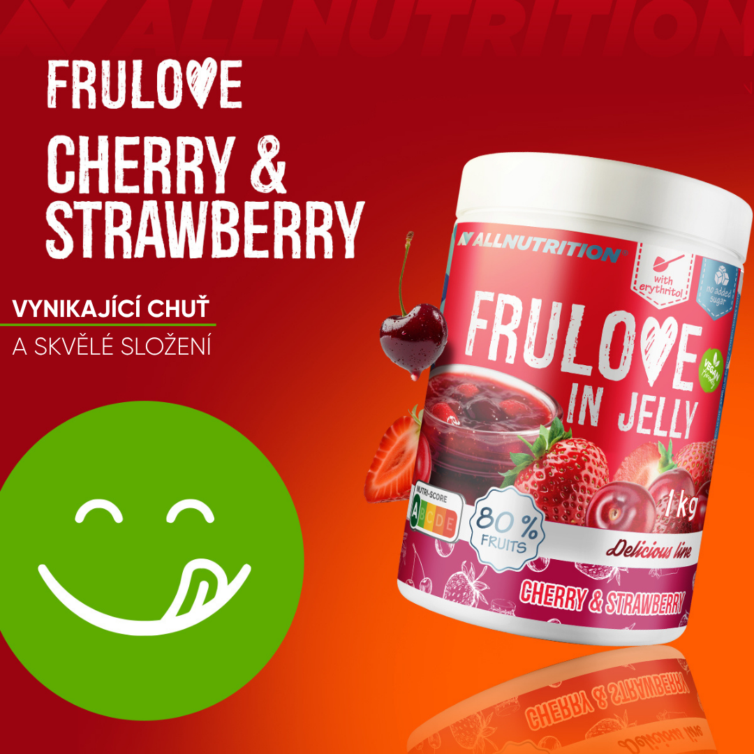 ALLNUTRITION FRULOVE IN JELLY CHERRY & STRAWBERRY je výborný džem, ve kterém jsou šťavnaté višně a jahody ponořené v jemném želé. Je to skvělá, lehčí alternativa k vysoce slazeným džemům, vytvořená pro všechny, kteří si chtějí vychutnat chuť ovoce bez zbytečného přidaného cukru. Ideální zpestření tvého jídelníčku bez výčitek!