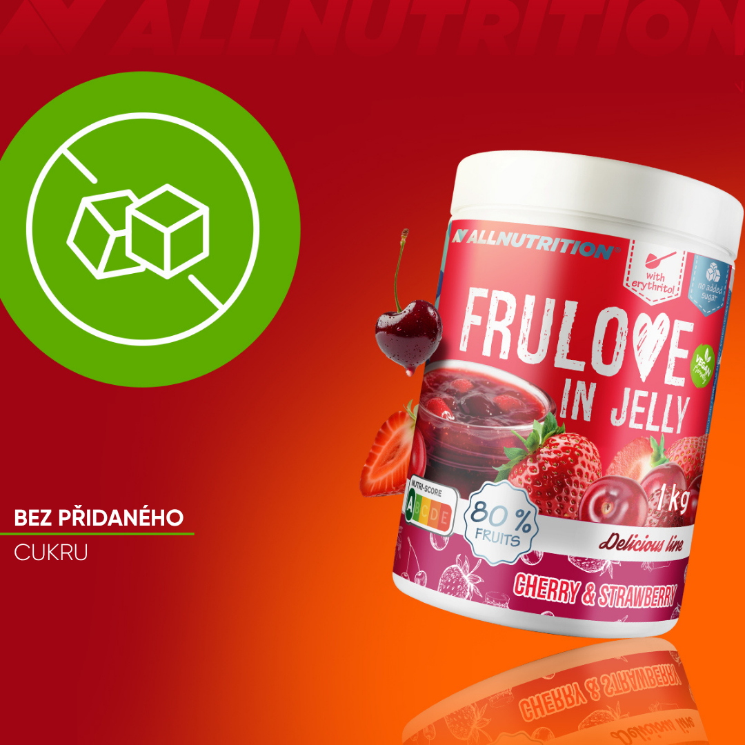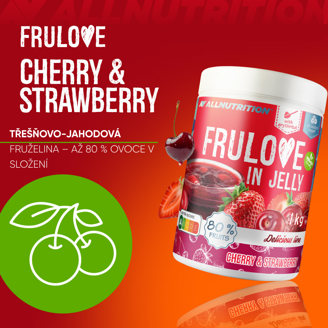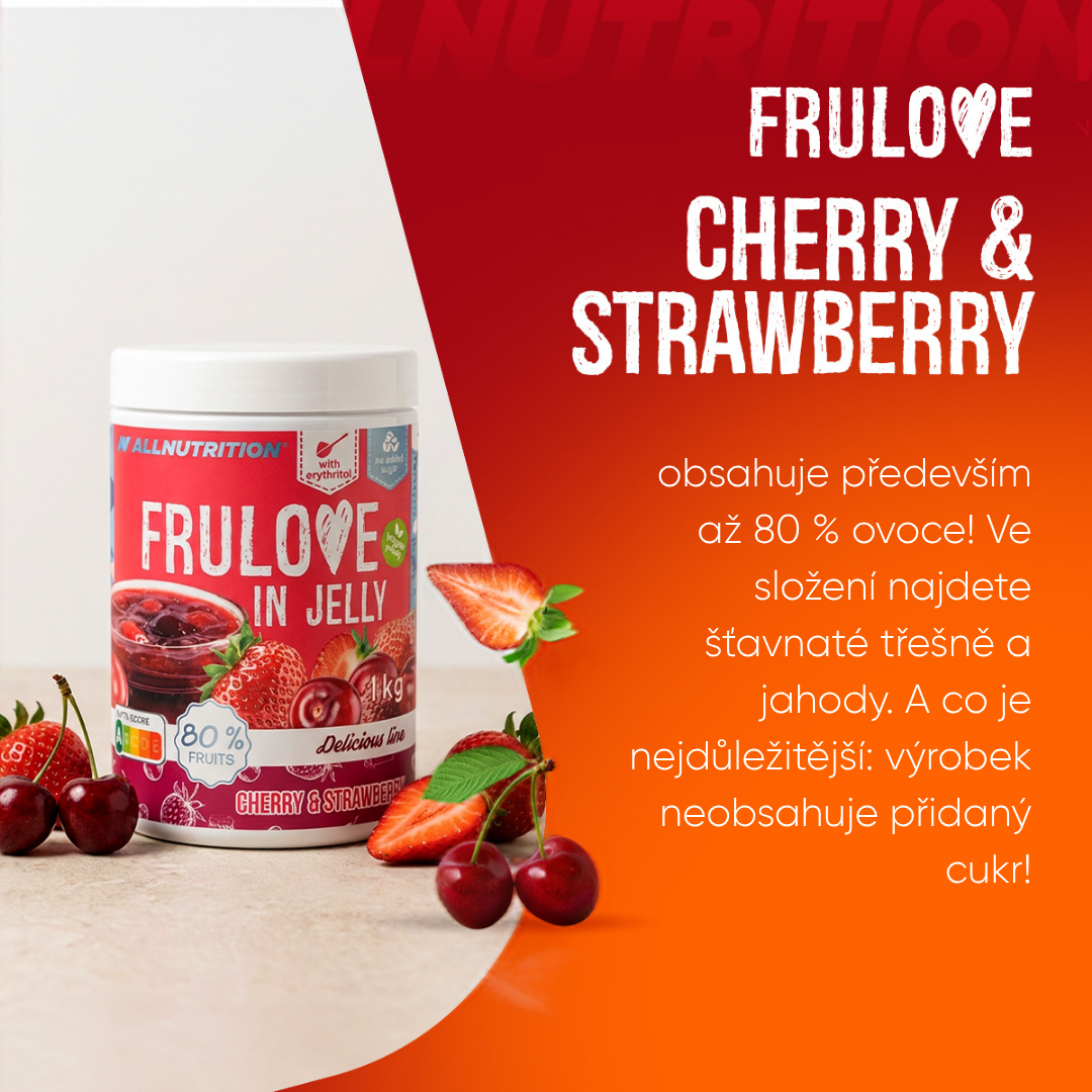 ALLNUTRITION FRULOVE IN JELLY CHERRY & STRAWBERRY je výborný džem, ve kterém jsou šťavnaté višně a jahody ponořené v jemném želé. Je to skvělá, lehčí alternativa k vysoce slazeným džemům, vytvořená pro všechny, kteří si chtějí vychutnat chuť ovoce bez zbytečného přidaného cukru. Ideální zpestření tvého jídelníčku bez výčitek!