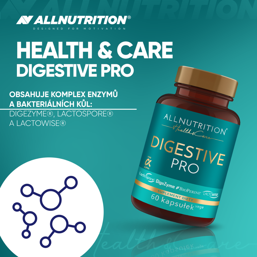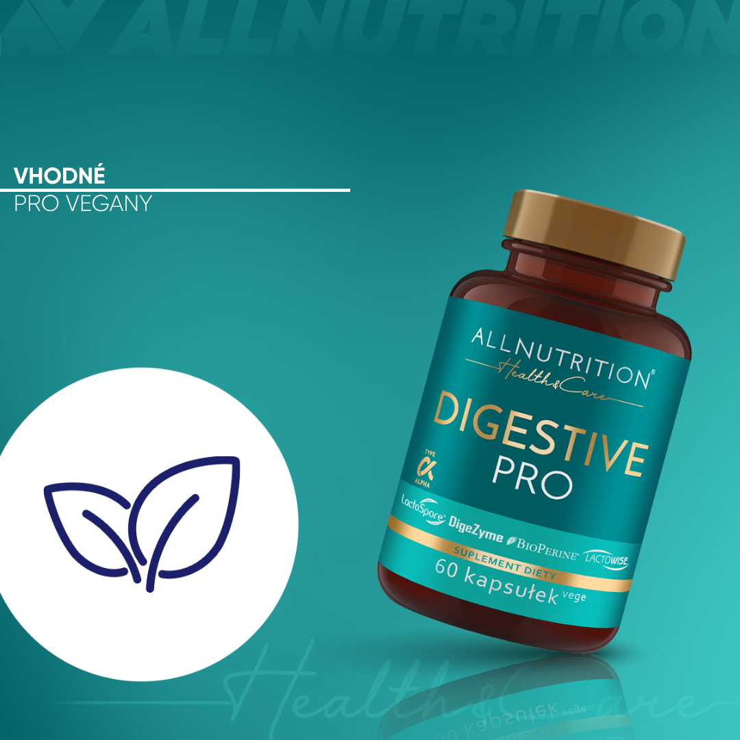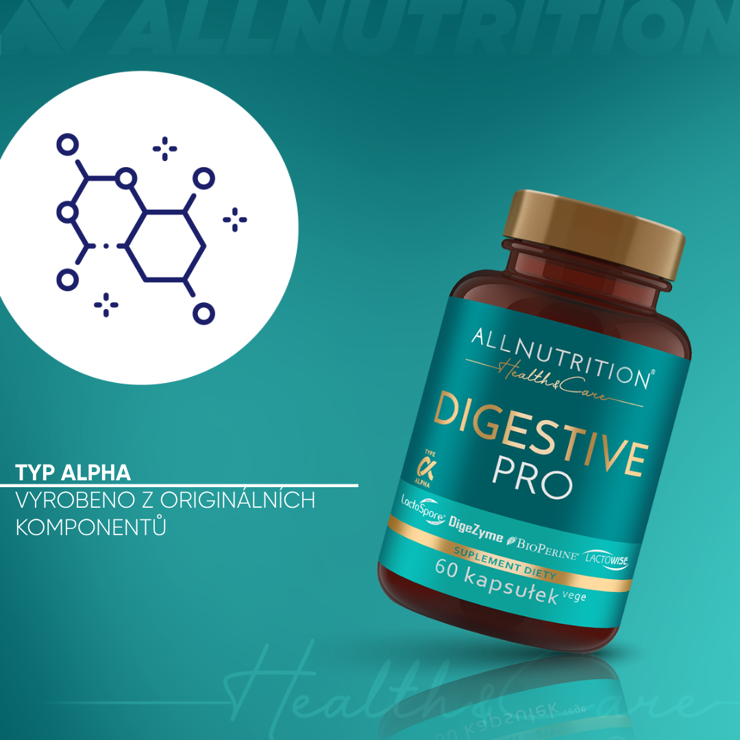enzymatický komplex digezyme® [α-amyláza (z aspergillus oryzae), neutrální proteáza (z bacillus subtilis), celuláza (z trichoderma longibrachiatum), laktáza (z aspergillus oryzae), lipáza (z rhizopus oryzae)], betain hydrochlorid, obal tobolky (hydroxypropylmethylcelulóza), probiotický komplex lactospore®, lactowise® probiotický a prebiotický komplex, papain, bromelain, beta-1,3/1,6-d glukan z pivovarských kvasinek saccharomyces cerevisiae, protispékavá látka: hořečnaté soli mastných kyselin, bioperine® piper nigrum ovocný extrakt z černého pepře, protispékavá látka: oxid křemičitý