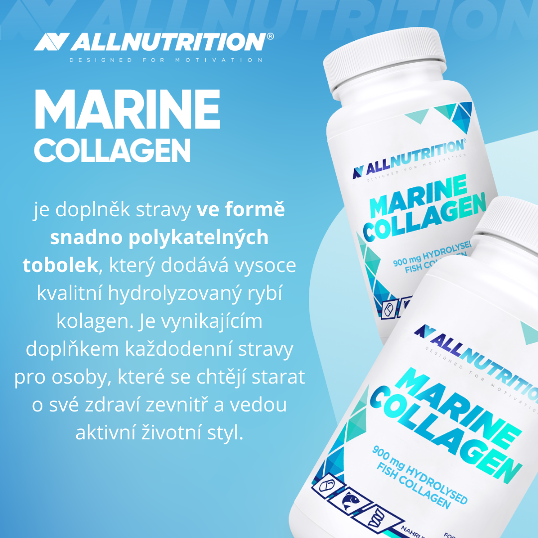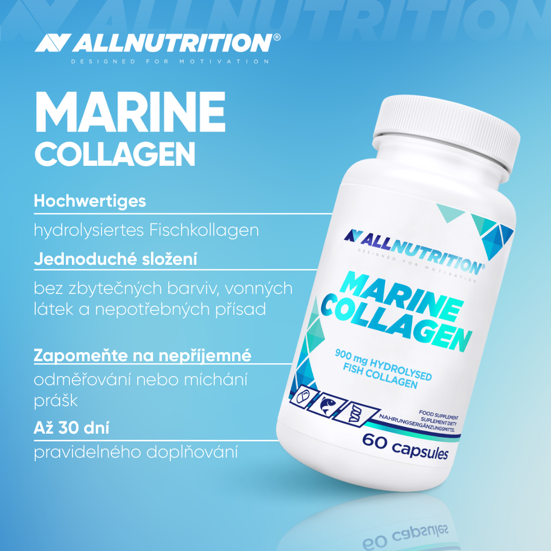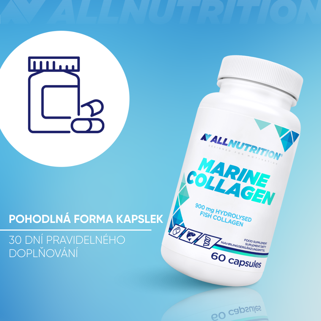 ALLNUTRITION MARINE COLLAGEN je doplněk stravy ve formě snadno polykatelných kapslí, který dodává vysoce kvalitní hydrolyzovaný rybí kolagen. Představuje skvělé doplnění každodenní stravy pro osoby, které o sebe chtějí pečovat zevnitř a vedou aktivní životní styl. Pokud sníš o účinné podpoře svého organismu, tento produkt je pro tebe ideální volbou! Užij si jednoduchou suplementaci bez zbytečných přísad.