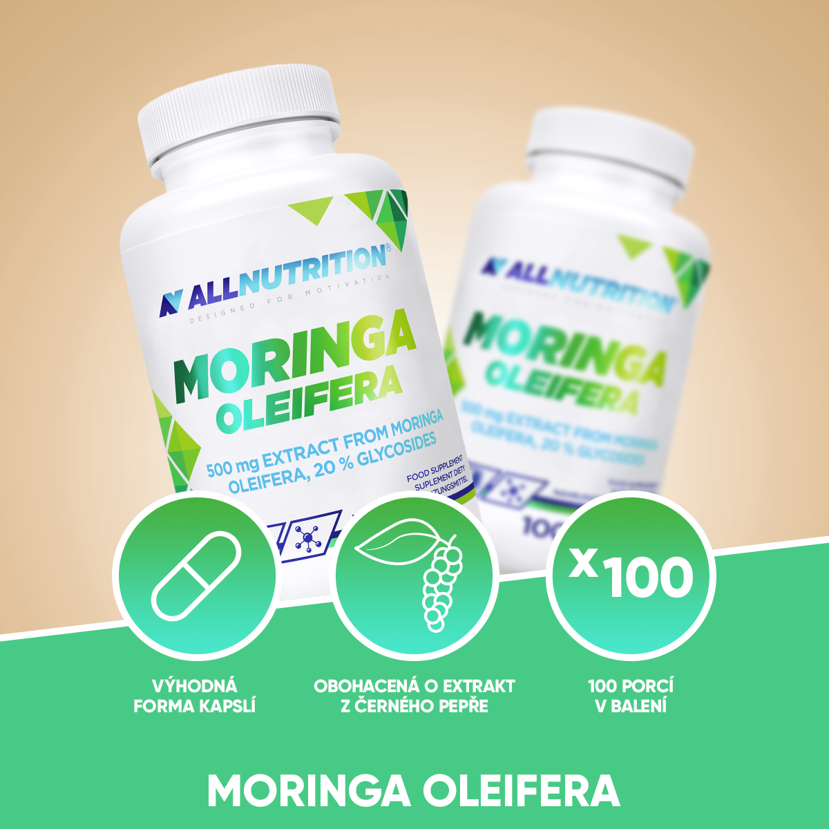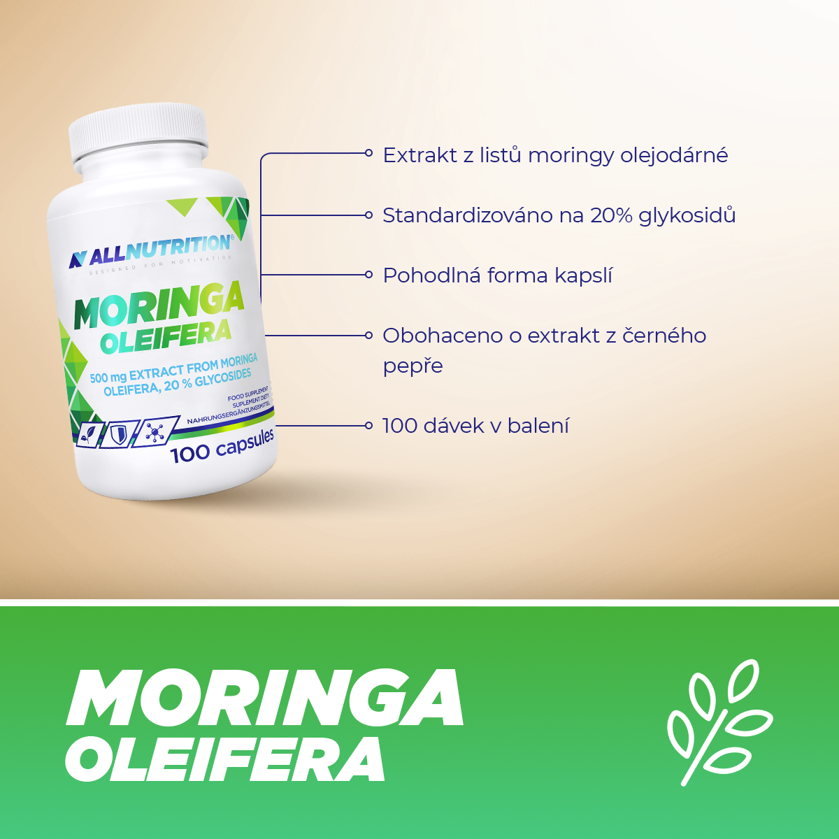 ALLNUTRITION MORINGA OLEIFERA je doplněk stravy obsahující extrakt z listů moringy olejodárné, standardizovaný na 20 % glykosidů. Přípravek byl obohacen o extrakt z černého pepře pro lepší vstřebávání živin.
