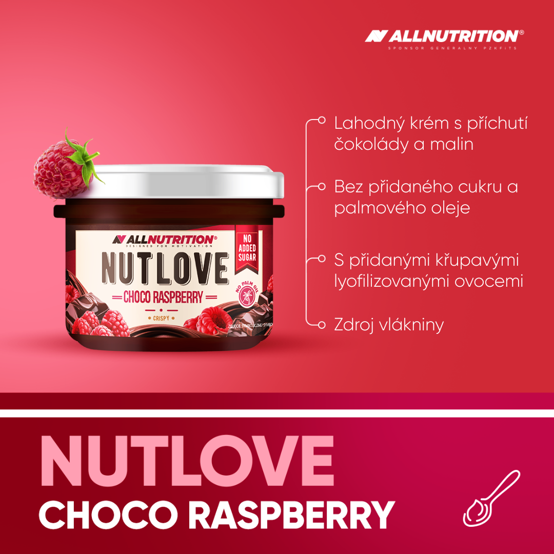 ALLNUTRITION NUTLOVE CHOCO RASPBERRY je lahodný čokoládovo-malinový krém s kousky křupavých, lyofilizovaných malin. Nová, okouzlující verze bestsellerové řady krémů NUTLOVE, která si získala srdce tisíců zákazníků. Ideální pro všechny, kteří hledají zdravější alternativu ke klasickým sladkostem, aniž by se museli vzdát výjimečné chuti. Krém neobsahuje přidaný cukr ani palmový olej, a proto je skvělým doplňkem k vašim oblíbeným fit dezertům.