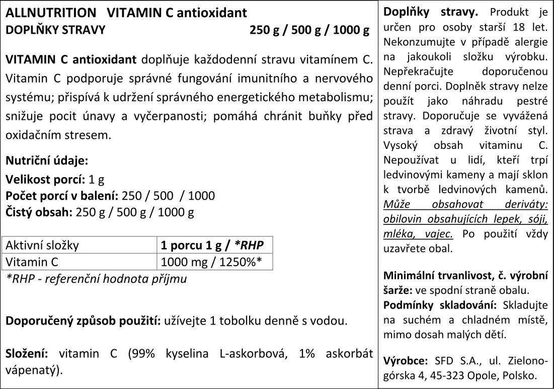 ALLNUTRITION VITAMIN C ANTIOXIDANT slouží k doplnění vitamínu C. Vysoké množství tohoto vitamínu odlišuje VITAMIN C ANTIOXIDANT od jiných konkurenčních výrobků. Vitamín C – kyselina askorbová – je organická sloučenina ze skupiny nenasycených poly-hydroxylových alkoholů. Zdrojem vitamínu C jsou potraviny rostlinného původu, ve velkém množství jsou obsaženy v šípkových plodech, černém rybízu, jahodách, citrusových plodech, a taktéž v zelí a bramborách.