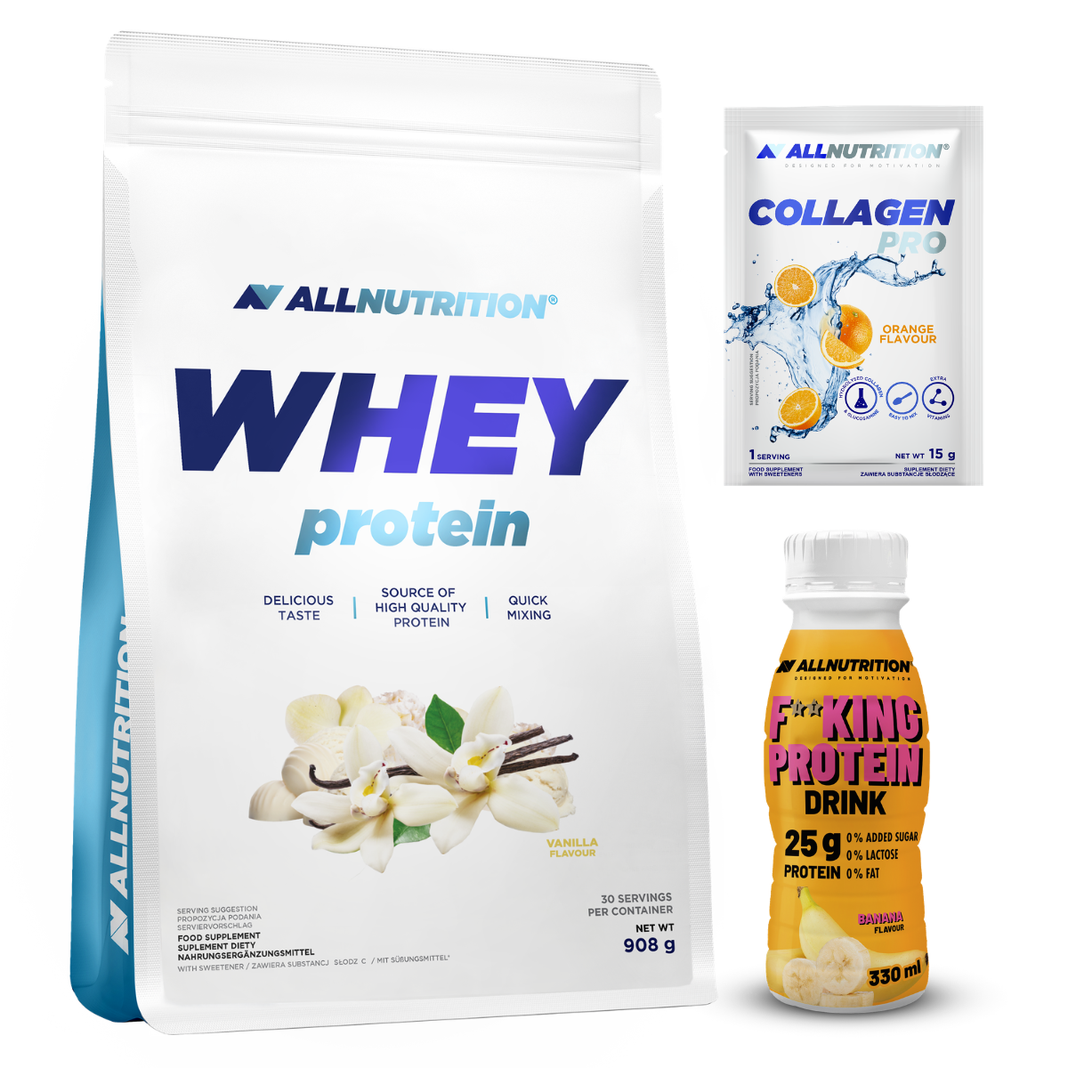 Pouze teď! Kupte ALLNUTRITION Whey Protein 908g a získejte dárky - Fitking Protein Drink + Collagen Pro sáček! jedna sada dárků na objednávku, dle dostupnosti. Příchutě jsou přidávány náhodně.