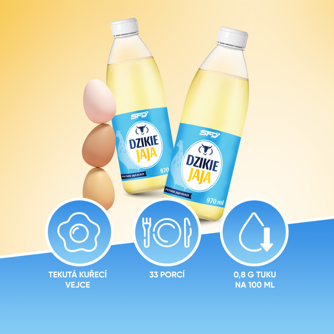 SFD DIVOKÁ VEJCE jsou pohodlnou možností, jak dodat vysoce kvalitní bílkoviny z vajec, včetně nezbytných aminokyselin. Tento produkt byl vytvořen pro osoby, které usilují o obohacení jídelníčku o nízkotučné zdroje bílkovin a současně hledají praktická kulinární řešení. Díky použití procesu pasterizace se produkt DIVOKÁ VEJCE vyznačuje zvýšenou trvanlivostí a odolností vůči vnějším podmínkám.