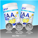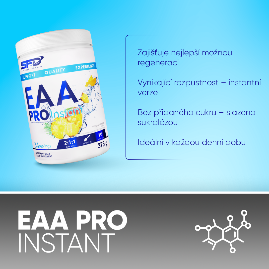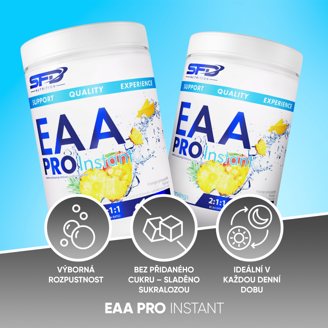SFD EAA PRO INSTANT doplněk stravy obsahující všechny esenciální aminokyseliny (EAA), tedy ty, které si tělo nedokáže samo syntetizovat a musí je získávat z vnějších zdrojů. Složení: histidin, isoleucin, leucin, valin, lysin, methionin, fenylalanin, threonin, tryptofan a navíc také arginin.