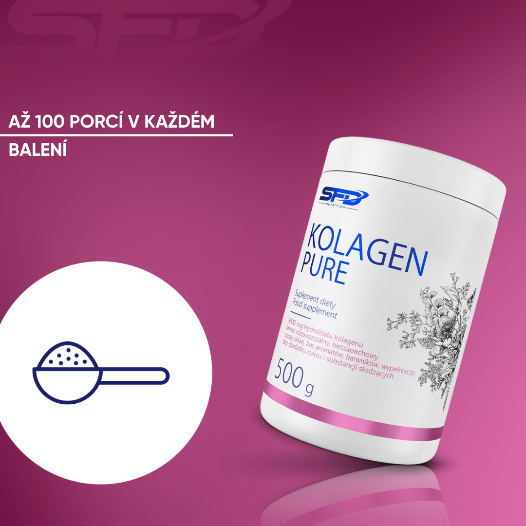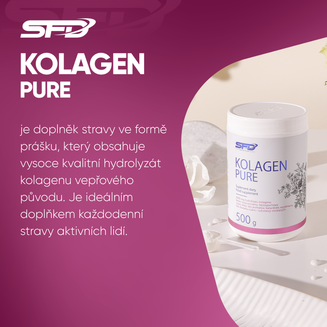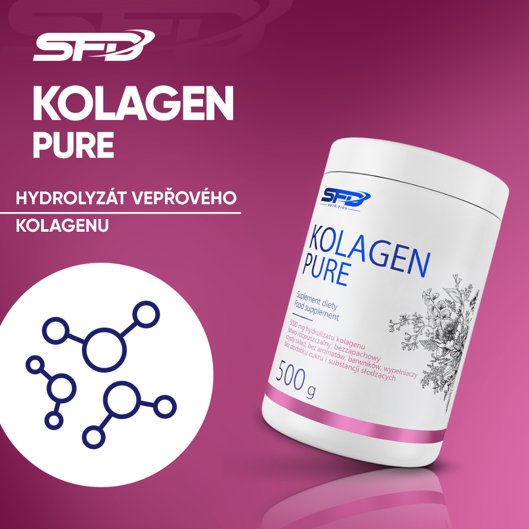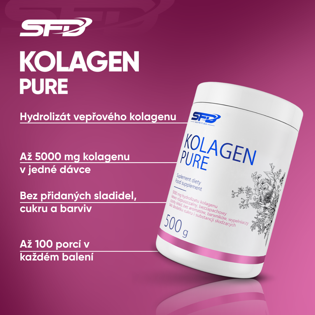 SFD KOLAGEN PURE je práškový doplněk stravy na bázi hydrolyzovaného vepřového kolagenu určený lidem, kteří dbají o zdravý vzhled své pokožky, a také těm, kteří sportují, po sportovních úrazech a během rekonvalescence. Výrobek se skládá ze 100% hydrolyzovaného kolagenu, bez zbytečných přídatných látek, cukru a ucpávek.