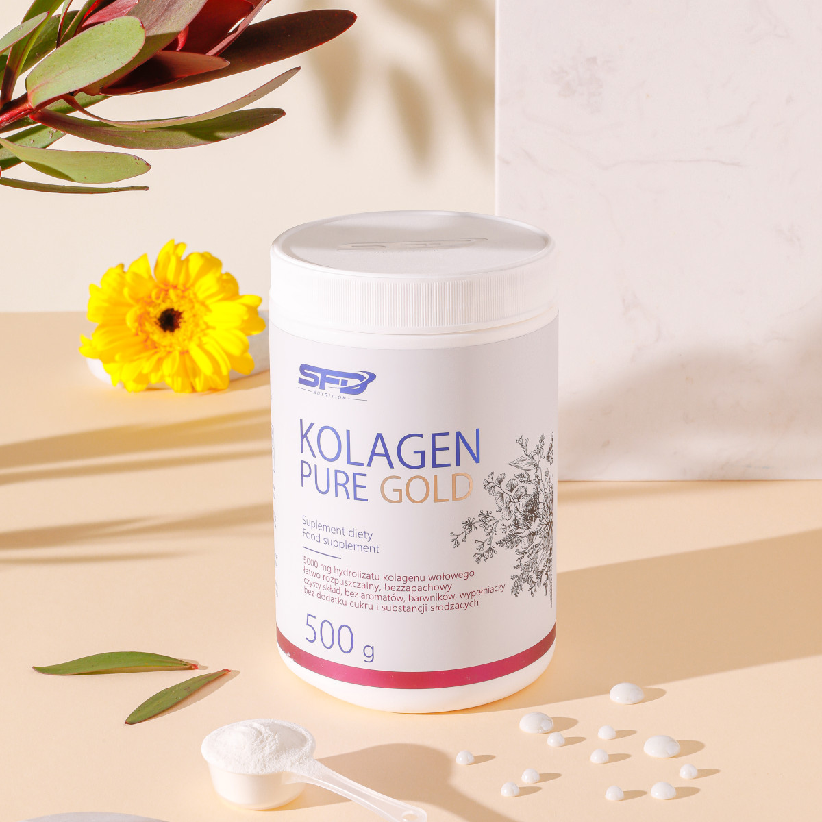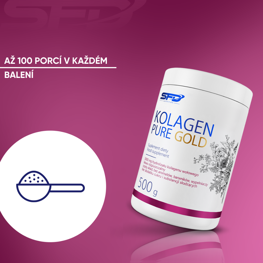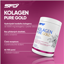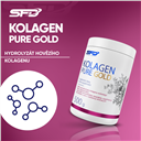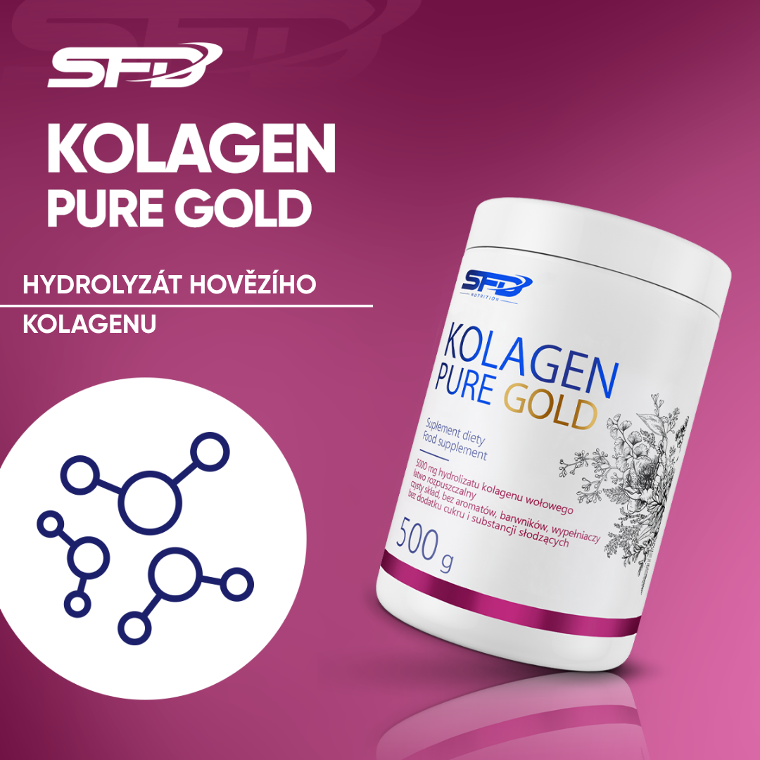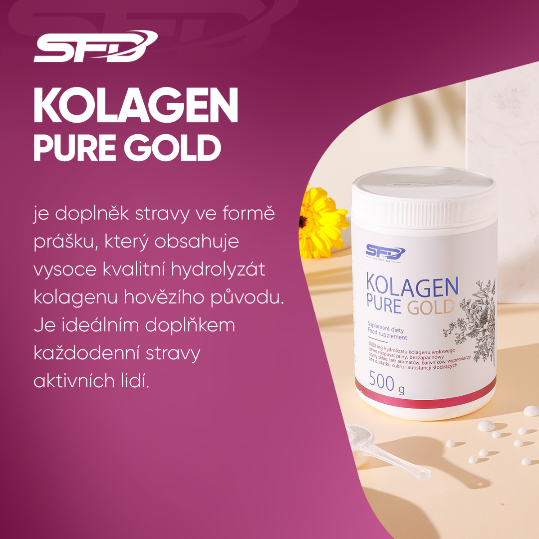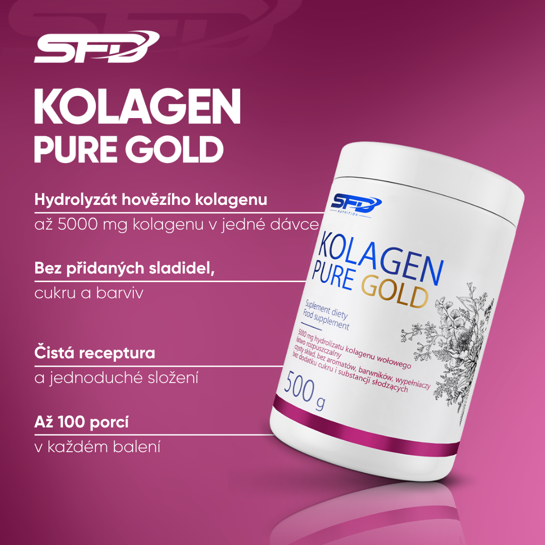 SFD KOLAGEN PURE GOLD je práškový doplněk stravy na bázi hydrolyzovaného hovězího kolagenu určený lidem, kteří dbají o zdravý vzhled své pokožky, a také těm, kteří sportují, po sportovních úrazech a v období rekonvalescence. Výrobek se skládá ze 100% hydrolyzovaného kolagenu, bez zbytečných přídatných látek, cukru a ucpávek.