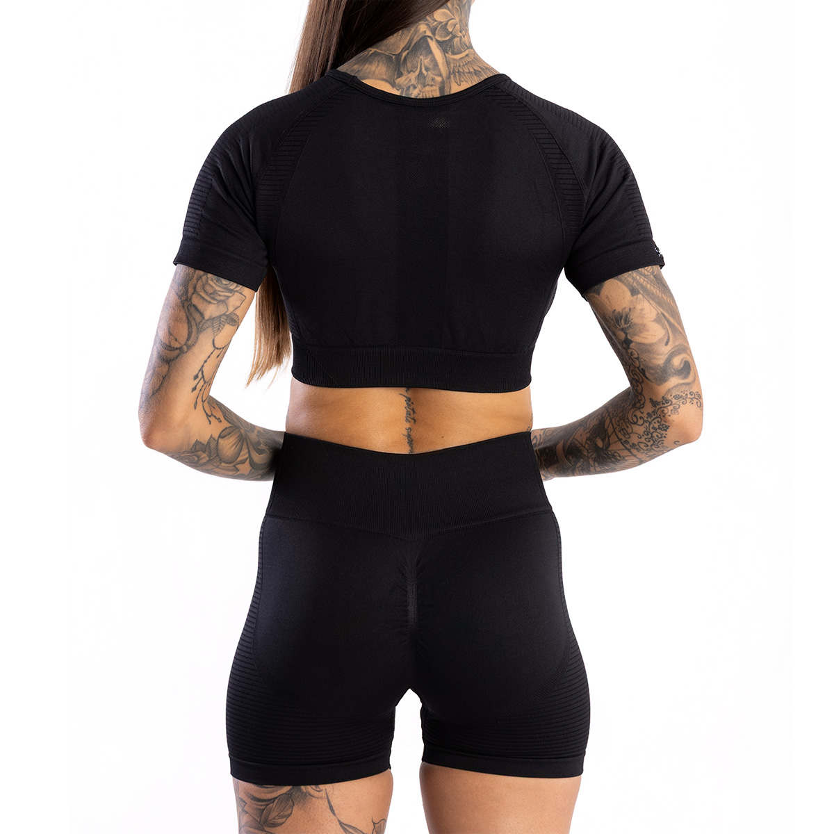 SEAMLESS SHORTS PUSH UP BLACK vytvořené s důrazem na detaily jsou bezešvé a mají tvarující vlastnosti. Zdůrazňují přirozenou krásu každé ženy! Vysoký pas se širokou gumou modeluje oblast břicha a push-up efekt spolu s ozdobnými texturami pod hýžděmi zvýrazňuje jejich tvar. Šortky se vyznačují elastickým a na dotek příjemným materiálem, který zajišťuje ideální přizpůsobení tělu a vysoký komfort při nošení.